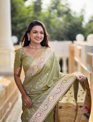 Lumion women’s Soft Banarasi Silk Saree with Minakari Weaving & Tassels(BN5_Mahendi) (L)