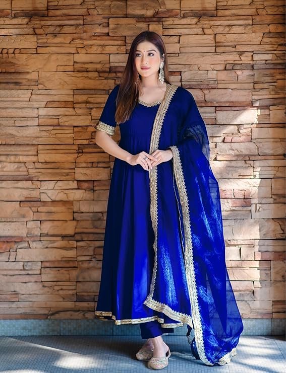 Elaro GoSriKi Women’s Rayon Blend Solid Anarkali Kurta with Pant & Dupatta (S)