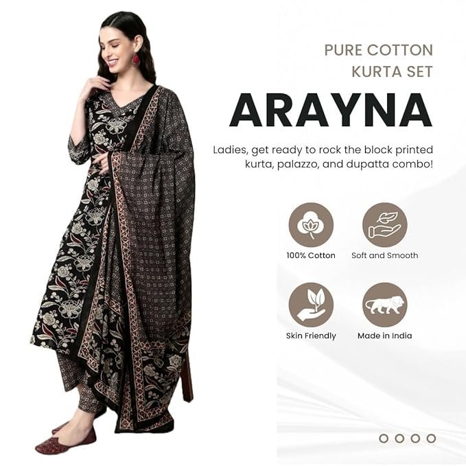 Next-Gen Nexora Arayna Women’s Cotton Block Printed Straight Kurta with Palazzo Pant. (L) crafted for comfort, durability, and modern appeal.