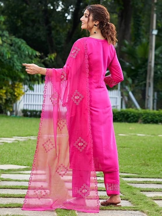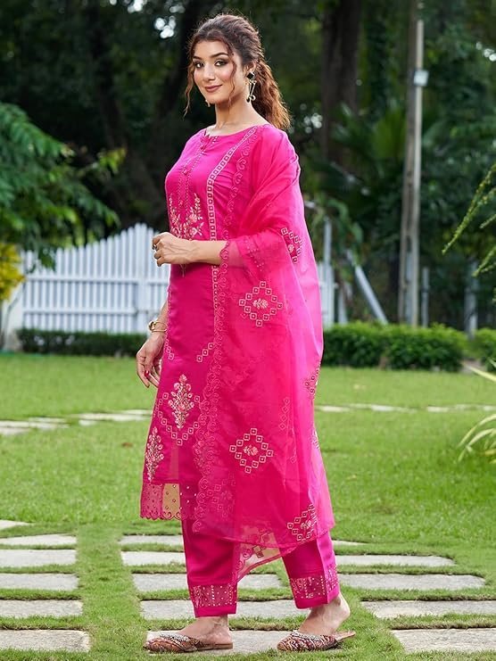 Zenova INDO ERA Women’s Silk Blend Embroidered Straight Kurta Set. (L)
