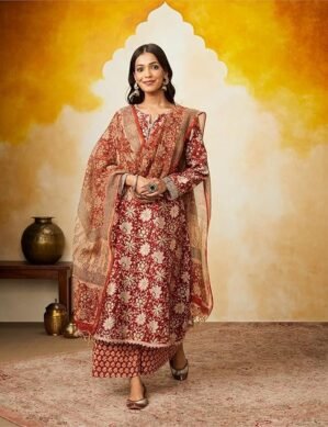 Eco-Friendly Elaro Myx Women’s Silk Chanderi Handblock Printed Authentic Kurta Set with Dupatta (A-Line | Bagru Print) (XXL) crafted for comfort, durability, and modern appeal.