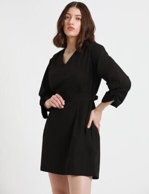 Premium Elaro DL Woman V-Neck Solid A-line Belted Dress. (M) crafted for comfort, durability, and modern appeal.
